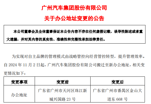 广汽集团(601238.SH)近日公告宣布,对自主品牌的管理模式从“战略管控”向“经营管控”转变,并配合此变革实施组织架构的调整。同时,为实现此转型,公司决定将总部由广州市珠江新城CBD搬迁至广州市番禺区。而据公司官网,搬迁已于11月2日完成,11月4日在新址正常办公。