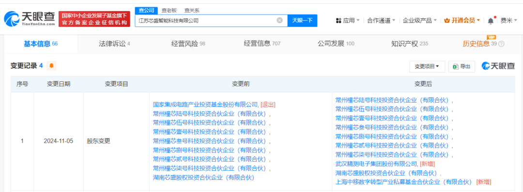天眼查App显示,近日,江苏芯盛智能科技有限公司发生工商变更,原股东国家集成电路产业投资基金股份有限公司退出,新增中移资本旗下上海中移数字转型产业私募基金合伙企业(有限合伙)、精测电子(300567)为股东,同时多位主要人员发生变更。