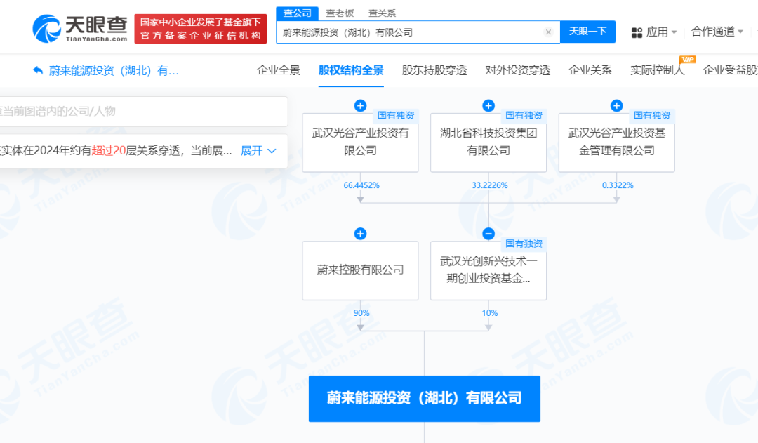 股东信息显示,该公司现由蔚来控股有限公司、武汉光创新兴技术一期创业投资基金合伙企业(有限合伙)分别持股90%、10%。