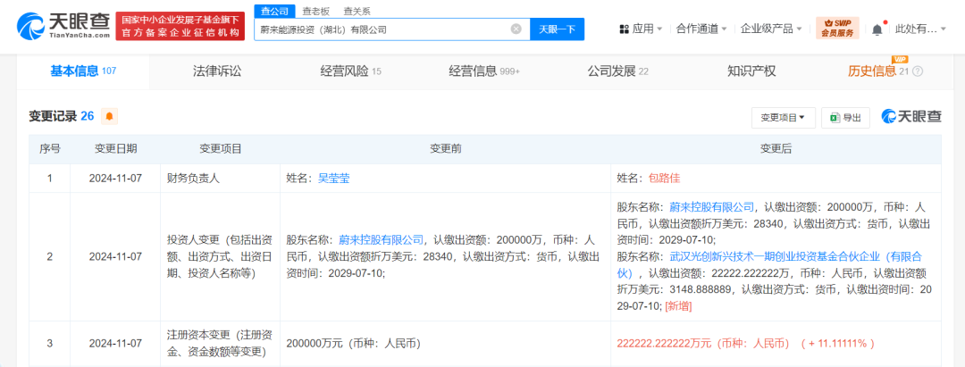 天眼查App显示,近日,蔚来能源投资(湖北)有限公司发生工商变更,新增光谷产业投资基金旗下武汉光创新兴技术一期创业投资基金合伙企业(有限合伙)为股东,注册资本由20亿人民币增至约22.22亿人民币,同时,部分主要人员也发生变更。