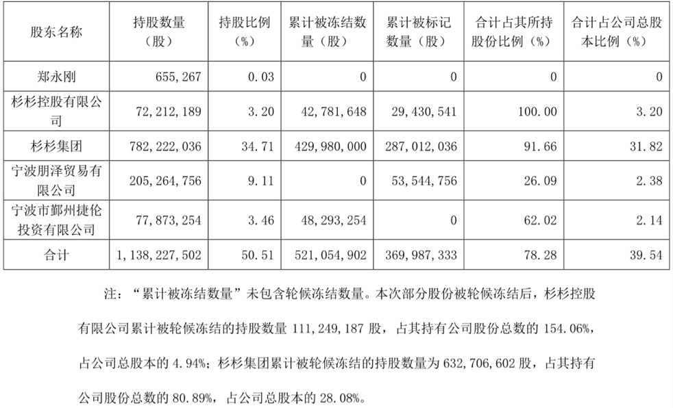 截至目前,杉杉集团共计持有杉杉股份7.82亿股,其中4.3亿股被司法冻结,另外2.87亿股被司法标记,合计占其持股比例的91.66%,占公司总股本的31.82%。同时杉杉集团及其一致行动人合计持有杉杉股份11.38亿股,持股比例为50.51%,其中被司法冻结、标记的股份数量为8.91亿股,在其所持股份中的占比达78.28%,占公司总股本的39.54%。