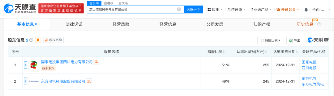 此外还有近日成立的凉山信和风电开发有限公司。该公司法定代表人为惠小平,注册资本500万人民币,经营范围为发电业务、输电业务、供(配)电业务。股东信息显示,该公司由国家电投集团四川电力有限公司、东方电气(600875)旗下东方电气风电股份有限公司分别持股51%、49%。