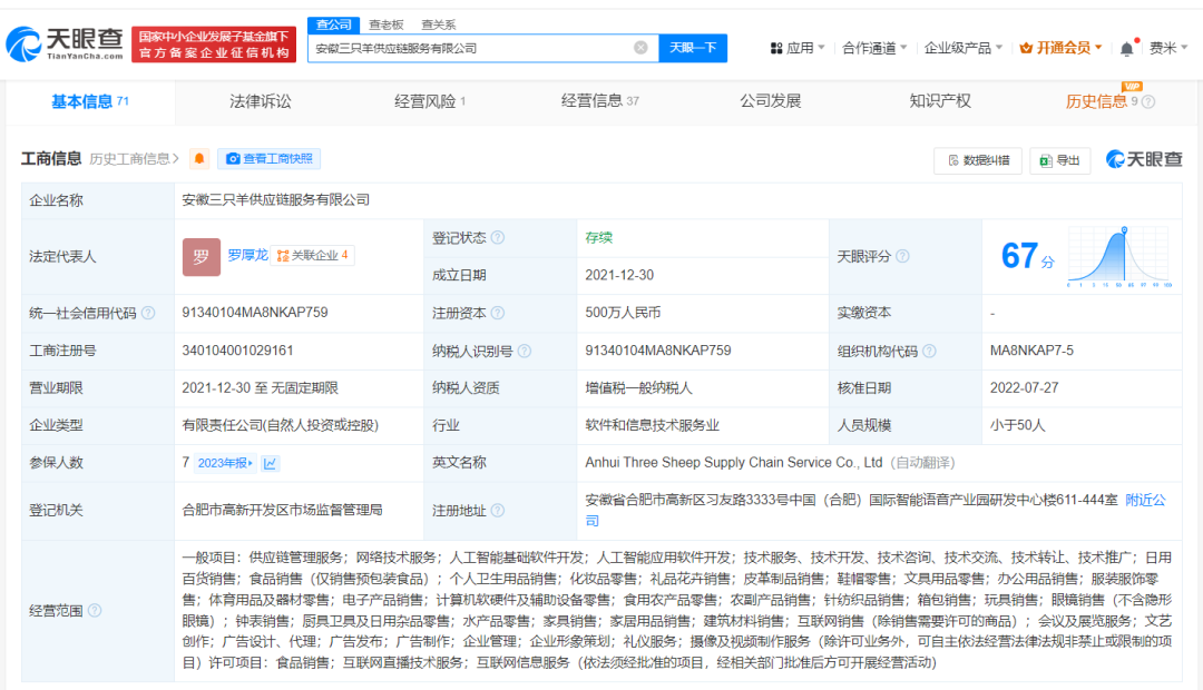安徽三只羊供应链服务有限公司成立于2021年12月,法定代表人为罗厚龙,注册资本500万人民币,经营范围含供应链管理服务、网络技术服务、人工智能基础软件开发、人工智能应用软件开发、日用百货销售、个人卫生用品销售等。