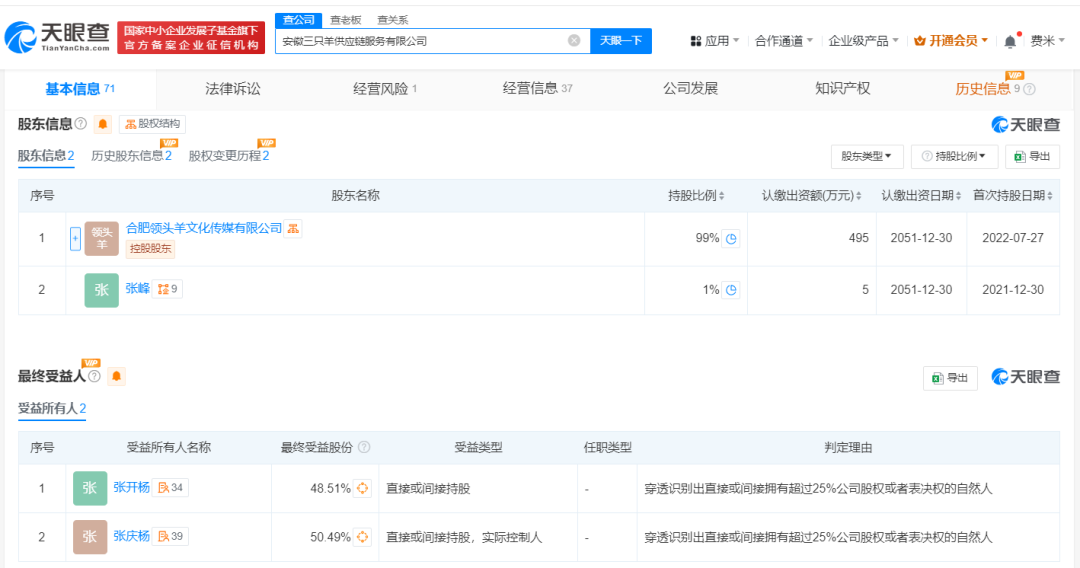 该公司由张峰、合肥领头羊文化传媒有限公司分别持股1%、99%,后者由张庆杨(疯狂小杨哥)和张开杨(疯狂大杨哥)分别持股51%、49%