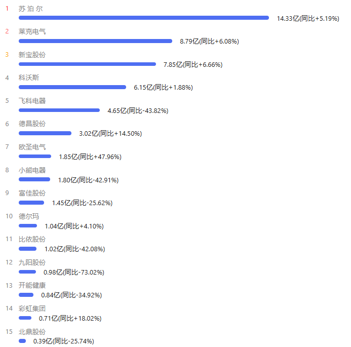 公开数据显示,今年第三季度,苏泊尔(002032.SZ)获得营收55.48亿元,同比增长3.03%;实现归母净利润4.92亿元,同比增长2.22%;新宝股份(002705.SZ)营收实现49.67亿元,同比增长12.88%;归母净利润为3.43亿元,同比增长0.53%;小熊电器(002959.SZ)获得营收10.08亿元,同比增长3.17%;归母净利润为1923.93万元,在同比大幅下降的情况维持了盈利状态。