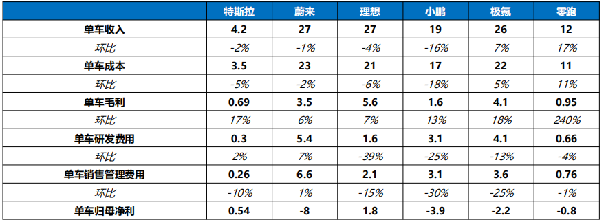综上来看,除了蔚来2024年Q3亏损扩大,小鹏、极氪与零跑均大幅减亏。而据日前东吴证券研报,2024年Q3零跑单车毛利环增2.4倍至0.95万元/辆,表现大超预期;蔚来、理想单车毛利环比小幅改善,小鹏则环增13%,极氪环增18%。且除了蔚来以外,其他上市车企单车费用均有明显下降,带动单车净利改善较毛利更为显著。