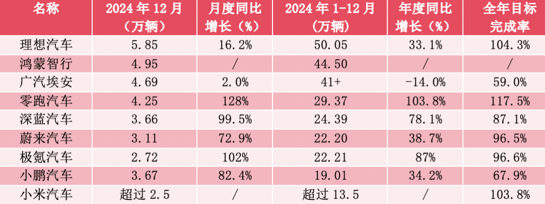 岁末年初,造车新势力2024年12月及全年销量出炉。在已经发布年度销量数据的车企中,理想汽车以5.85万辆坐上新势力12月销冠;鸿蒙智行、广汽埃安(微信公众号口径,除有说明外均同)与零跑月度销量均在四万辆以上,尤其鸿蒙智行与零跑均创下月度交付量新高。