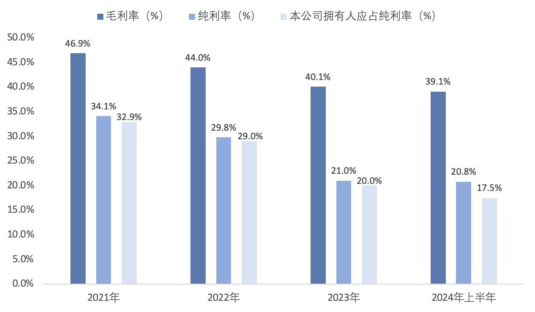 深入分析发现,药明生物股价的长期下行可能与该公司的业绩经营表现有关。近年来,药明生物的收益和该公司拥有人应占纯利总体呈现出增长态势,但同期多个反映公司盈利能力的财务数据却均有所下滑。从2021年至2023年,药明生物的毛利率从46.9%降至40.1%,纯利率从34.1%降至21.0%,而该公司拥有人应占纯利率也从32.9%减少至20.0%。并且,这一下行趋势一直延续到了2024年上半年。