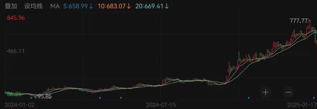 进入2024年,寒武纪的股价突然迎来大幅上涨。10月后,该公司每股股价相继突破400元、500元和600元大关,最终于2025年1月10日创下上市以来的新高——777.77元/股。