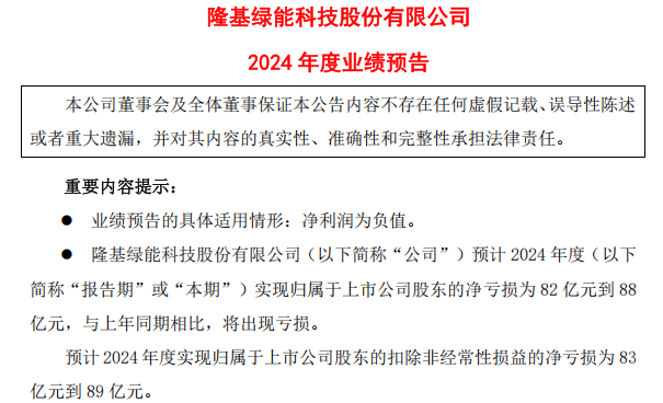 隆基绿能发布的业绩预告显示,预计2024年度(下称本期)实现归母净亏损为82亿元到88亿元;预计扣非后归母净亏损为83亿元到89亿元。这是隆基绿能自2013年以来首次出现年度亏损,在2022年、2023年,公司归母净利润尚高达148.12亿元、107.51亿元。