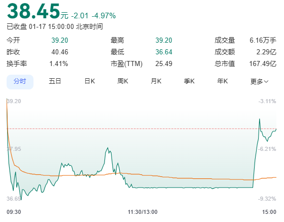 1月17日开盘,中国首个小家电上市公司上海飞科电器股份有限公司(下称飞科电器,603868.SH)股价突然下跌,后持续下跌,最低达到36.64元/股,跌超6%,创2024年9月以来新低。当日,公司股价收于38.45元/股,下跌4.97%,成交额放大至超2亿元。1月20日,公司股价续跌,日跌幅为2.99%,最终收于37.3元/股。