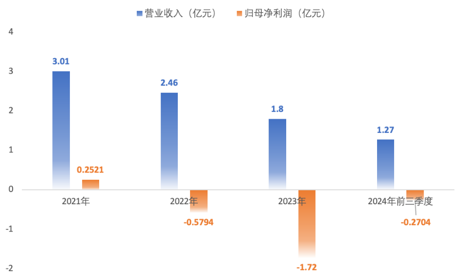 从数据来看,2021年至2023年,川大智胜的营业收入从3.01亿元降至1.80亿元,归母净利润则由盈利2520.92万元转变为连续两年亏损,2022年、2023年分别净亏5793.78万元和1.72亿元。