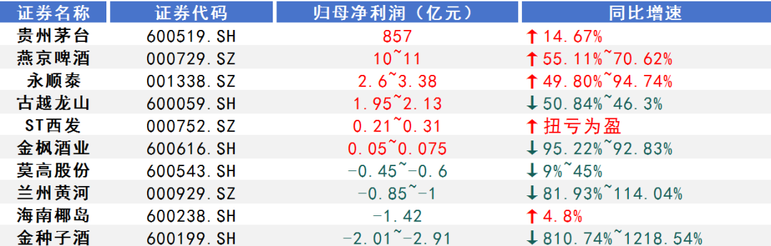 白酒方面,金种子酒(600199.SH)预计年度净亏损为2.01亿元至2.91亿元,同比增亏810.74%至1218.54%。海南椰岛(600238.SH)预计年度净亏损为1.42亿元。葡萄酒方面,莫高股份(600543.SH)预计年度净亏损约4500万元至6000万元,同比增亏约9%至45%。