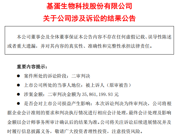 近日,基蛋生物(603387.SH)发布公告称,其与武汉博瑞弘管理咨询合伙企业(有限合伙)(下称博瑞弘)、胡淑君、马全海、关章荣、荣筱媛、马全新等九位的股权转让纠纷二审判决下达。本次诉讼为终审判决,判决结果为基蛋生物向上述原审原告支付3586.12万元收购款。