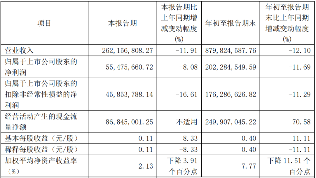 2024年前三季度,公司实现营收8.80亿元,同比下滑12.10%;实现归属于上市公司股东的净利润(下称归母净利润)2.02亿元,同比下滑11.69%。业绩降速较上年同期收窄,2023年前三季度公司营收、归母净利润同比降幅为27.32%、51.80%。
