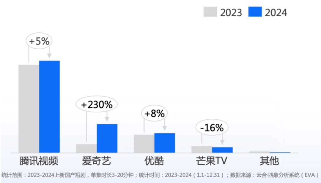 2024年,芒果TV聚焦探索微短剧新模式,共上线340部微短剧,但累计有效播放却同比缩减16%。同期,腾讯视频、爱奇艺和优酷上新短剧正片的有效播放均实现正增长,增幅分别为5%、230%和8%。