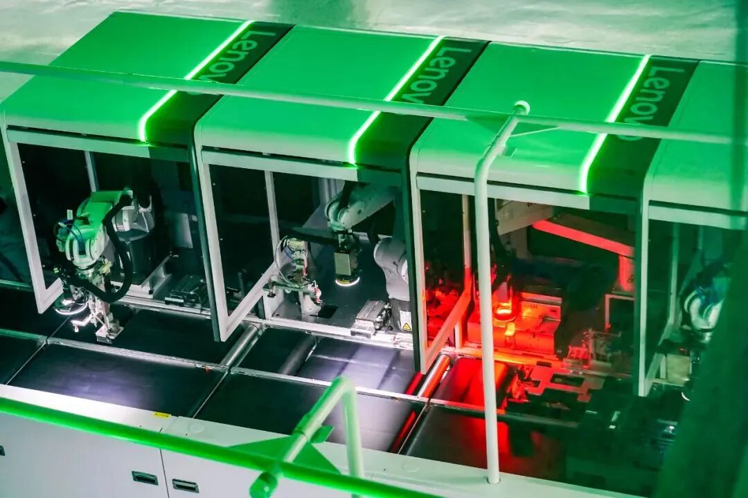 联想集团天津创新产业园产线场景。联想自有制造基地的很多设备都由有AI技术参与的数智化系统控制与调度,这些系统也与合作伙伴的数据库相互联通。