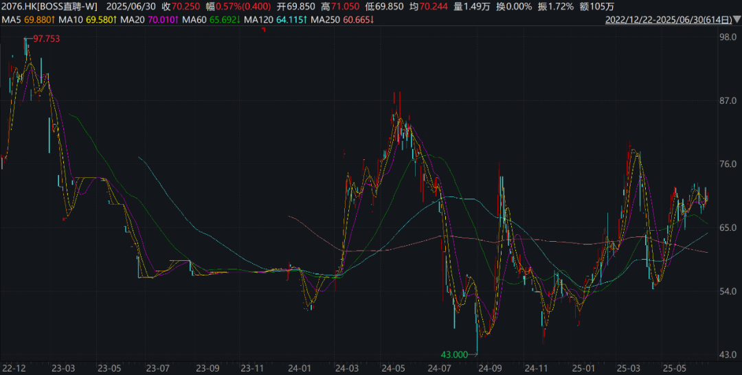 二级市场上,截至6月30日收盘,BOSS直聘美股当日下跌1.55%,收报17.84美元/股(不复权,下同),总市值为82亿美元。港股方面,截至6月30日收盘,BOSS直聘报70.25港元/股,总市值约为644亿港元。