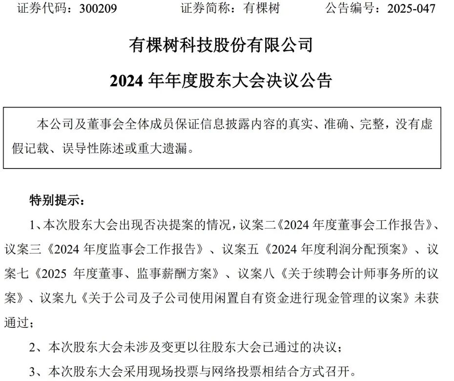 有棵树科技股份有限公司(下称有棵树,300209.SZ)近日召开2024年年度股东大会,有九项议案进入审议流程。最终投票结果显示,《2024年度董事会工作报告》《2024年度监事会工作报告》《2024年度利润分配预案》《2025年度董事、监事薪酬方案》《关于续聘会计师事务所的议案》及《关于公司及子公司使用闲置自有资金进行现金管理的议案》这六项议案,因遭到大比例股东投出反对或弃权票而未获通过。