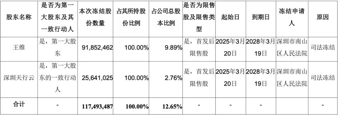 据悉,2025年4月,有棵树披露了股东股份被冻结的情况,第一大股东王维及其一致行动人深圳天行云所持有的全部股份均被司法冻结,合计达1.17亿股,占该公司总股本比例12.65%,到期日为2028年3月19日。