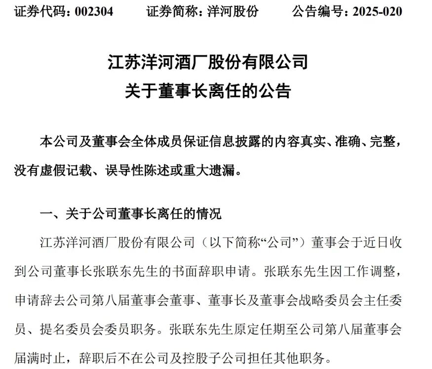 2025年7月1日晚间,江苏洋河酒厂股份有限公司(下称洋河股份,002304.SZ)发布了一则重要人事变动公告。公告显示,张联东因工作调整,申请辞去该公司第八届董事会董事、董事长及董事会战略委员会主任委员、提名委员会委员职务。此后,张联东将不在洋河股份及其控股子公司担任其他职务。洋河股份方面称,公司将尽快按照法定程序完成董事补选、新任董事长选举等相关工作。