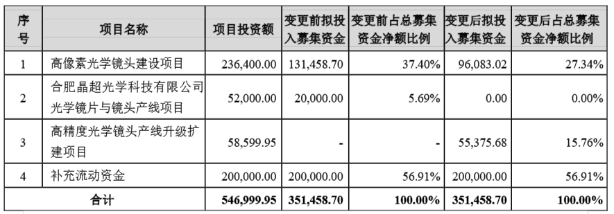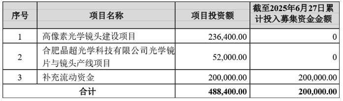 截至今年6月27日,欧菲光的拟募投项目调整为“高像素光学镜头建设项目”“合肥晶超光学科技有限公司光学镜片与镜头产线项目”以及“补充流动资金”三项,项目投资额分别为23.64亿元、5.20亿元和20亿元。