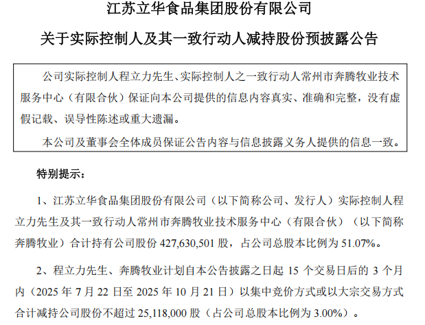 江苏立华食品集团股份有限公司(下称立华股份,300761.SZ)公告称,实控人程立力及其一致行动人常州市奔腾牧业技术服务中心(有限合伙)(下称奔腾牧业),计划于7月22日至10月21日,合计减持2511.8万股,占公司总股本3%。
