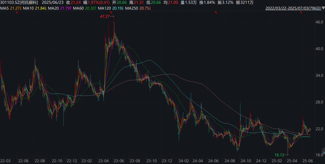 从近年来何氏眼科的股价走势来看,持续不断的减持压力已明显冲击市场信心。截至2025年7月2日收盘,公司股价报21.82元/股,较历史高点下跌逾60%。