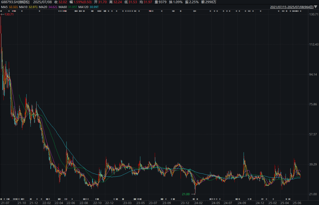 截至7月7日收盘,倍轻松报收于31.52元/股,公司当前总市值为27.09亿元。