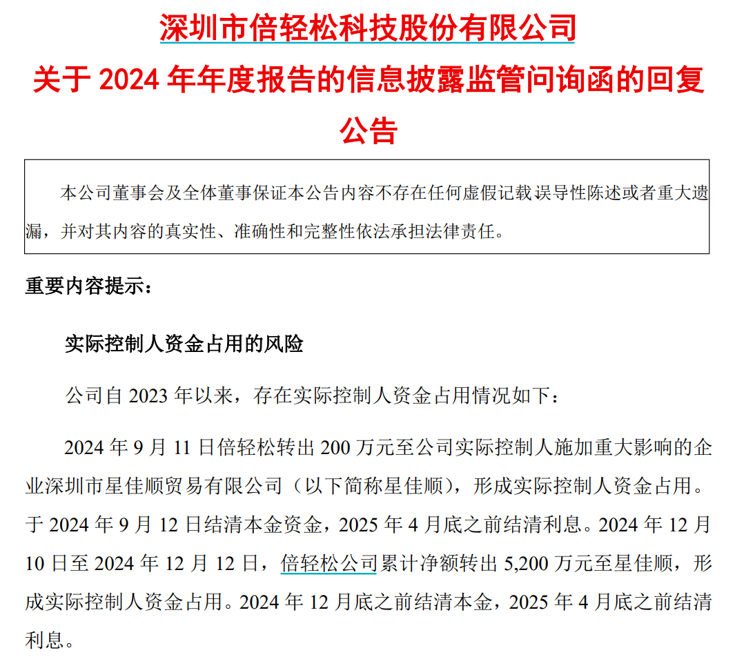 公告显示,倍轻松2023年以来存在实际控制人资金占用的情况,但相关款项涉及的本息均已结清。同时,针对年报问询函中涉及的关于经营业绩、境外收入、线下销售收入等11大问题,倍轻松均进行了相应的解释说明。
