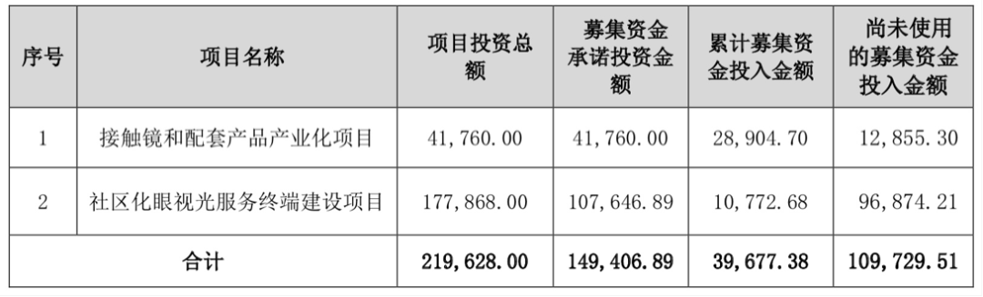 在业绩高速增长下,2022年6月,欧普康视通过定向增发完成15亿元募资。扣除发行费用后,公司净募资金额为14.94亿元,其中募资承诺投资“接触镜和配套产品产业化项目”金额为4.18亿元;承诺投资“社区化眼视光服务终端建设项目”金额为10.76亿元,该项目主要用来扩增社区化眼视光服务终端规模,公司计划用5年时间拟再建设1348个视光服务终端,包括诊所、视光中心等,这个数量较2021年底增长超4倍。