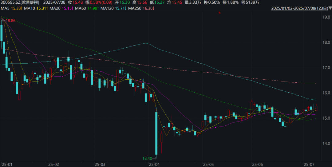 二级市场方面,在业绩支撑下,2017年至2021年,欧普康视股价5年期间合计涨超36倍,2021年5月,该公司市值一度超900亿元。受业绩低迷影响,欧普康视股价此后长期处于下行期。截至2025年7月7日收盘,欧普康视报15.39元/股(不复权),较2021年最高点股价已跌超85%,目前市值缩水至138亿元。