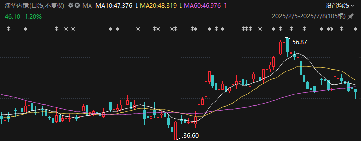 7月8日,公司股价早盘一度跌至44.53元/股(不复权,下同),创今年5月7日以来新低;此后虽有所拉起,但仍报收于46.10元/股,较年内高点跌近两成。7月9日,该公司开盘续跌。