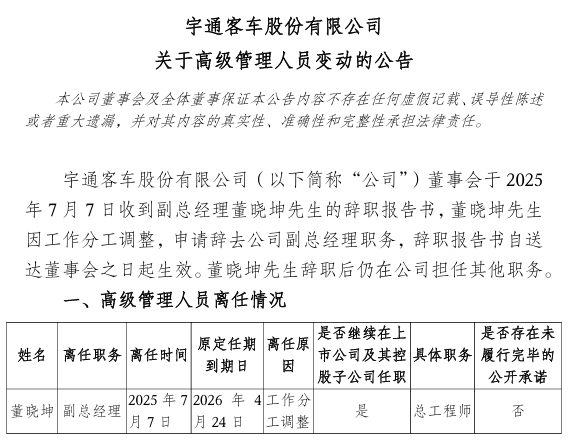 7月7日,宇通客车(600066.SH)发布公告称,原定任期至2026年4月的副总经理董晓坤,因工作分工调整,辞去副总经理职务,仍将继续担任总工程师一职。