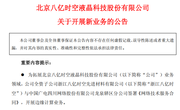 公告显示,八亿时空从事的电信网络边缘服务,是基于电信运营商网络基础设施,在靠近用户终端或网络边缘侧提供的服务,核心是将计算、存储、网络等资源下沉到网络边缘,以满足低延迟、大带宽、本地化处理等需求。