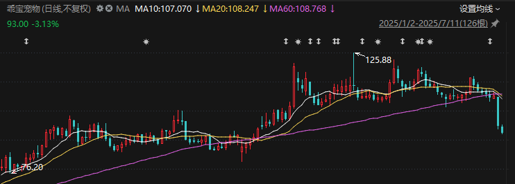7月10日,乖宝宠物收盘于96.0元/股,较前一交易日每股下挫12元,跌幅为11.11%。这一数值不仅为当日宠物经济板块个股最大跌幅,也创下今年以来公司单日最大跌幅。