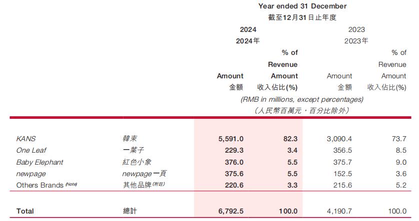 不过,公司抓住抖音平台发展机遇,2023年、2024年业绩实现高速增长。2024年,上美股份营收、归母净利润分别为67.93亿元、7.81亿元,同比增幅均在62%以上。收入大增主要归功于韩束,该品牌同比增长八成至55.91亿元,占比达至82.3%;一叶子收入却大幅下滑,红色小象则近乎与2023年持平。而公司于2022年推出的品牌——newpage一页同比大增一倍不止,逾三亿的收入体量几乎追平红色小象。