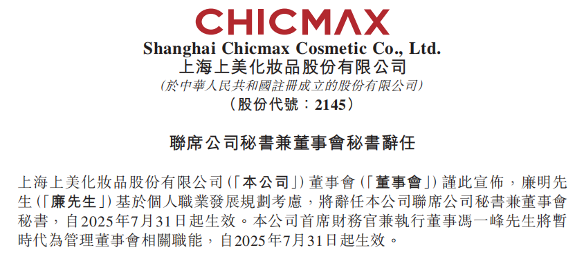 上海上美化妆品股份有限公司(下称上美股份,02145.HK)近日宣布,基于个人职业发展规划考虑,廉明将辞任公司联席公司秘书兼董事会秘书职务,该人事变更将自7月31日起生效。廉明辞任后,公司首席财务官兼执行董事冯一峰,将暂时代为管理董事会相关职能。据悉,廉明在上美股份任职不到五年,其上个“东家”是丸美生物(603983.SH),任职时间为十年。