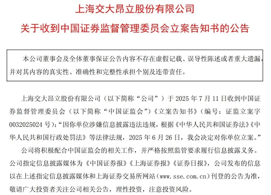 2025年7月11日,交大昂立收到中国证监会下发的《立案告知书》。相关信息显示,因涉嫌信息披露违法违规,中国证监会决定对该公司立案。交大昂立方面表示,将积极配合相关工作,并严格按照监管要求履行信息披露义务。