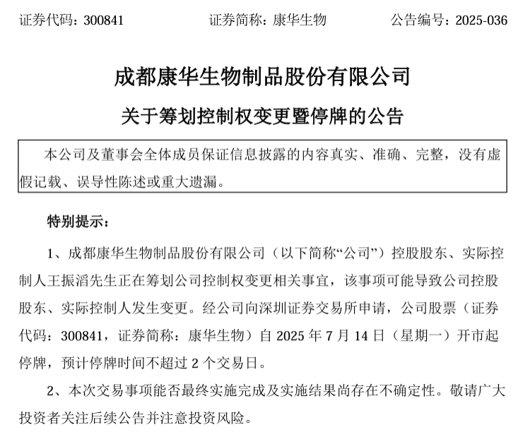 康华生物(300841.SZ)发布公告称,公司控股股东、实际控制人王振滔正在筹划控制权变更事项,这一重大变动可能导致公司实际控制人发生变更。受此影响,公司股票自7月14日开市起停牌,预计停牌时间不超过2个交易日。
