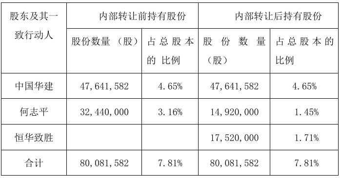 据公司公告显示,中国华建与恒华致胜的实际控制人均为何志平,本次股份变动为同一实际控制人下的股份转让,不涉及向市场增持或减持公司股份的情况,不会导致中国华建及其一致行动人的合计持股比例和数量发生变化。