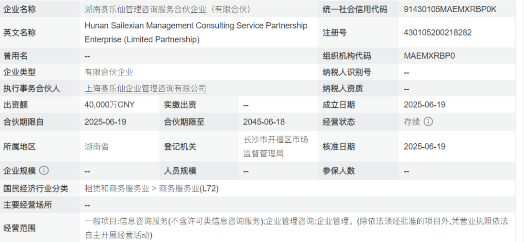 投资时间网、标点财经研究员注意到,在众多竞争者中脱颖而出的湖南赛乐仙是一家2025年6月19日刚刚成立的公司,其执行事务合伙人为上海赛乐仙企业管理咨询有限公司(下称上海赛乐仙)。湖南赛乐仙分别由上海赛乐仙、长沙开福国有资本投资运营有限公司分别持股75%和25%。