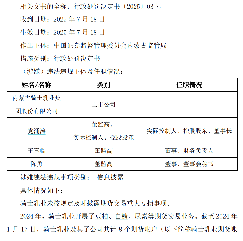 骑士乳业期货交易背离套保初衷,亏损超4000万元且未及时披露,触发监管严厉追责