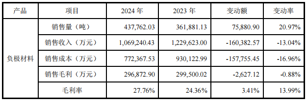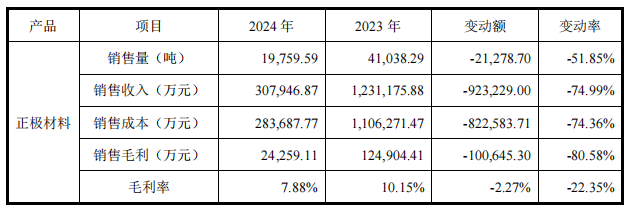 数据显示,2024年,贝特瑞的负极材料销量增长两成、突破43万吨,但在售价下行影响下,收入下滑、毛利额也较上年同期微降。而正极材料销量降至不到2万吨,同比降幅达51.85%,售价也大降48.05%,量价齐跌双重影响下,导致该业务收入与毛利额暴降。