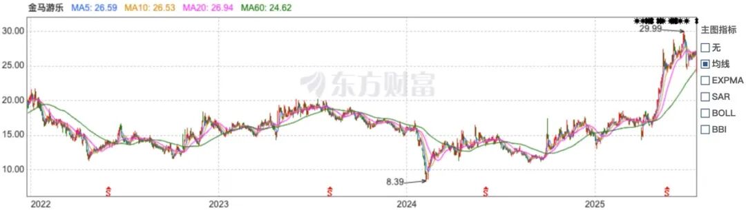 资本市场方面,金马游乐股价持续呈现震荡波动趋势。自2025年4月下旬起,该公司股价出现新一轮上行周期,相继突破20元/股、25元/股两大整数关口,并于2025年6月27日触及29.99元/股(按前复权计算,下同)阶段性高点,较2025年4月24日16.80元/股的收盘价上涨了78.51%,仅次于2019年3月7日创下的历史峰值(30.09元/股)。