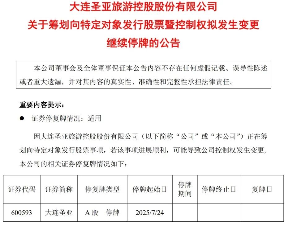 2025年7月23日晚间,大连圣亚披露公告称,因公司正在筹划向特定对象发行股票事项,若该事项进展顺利,可能导致该公司控制权发生变更。鉴于这一事项尚存在重大不确定性,为避免造成公司股价异常波动,大连圣亚股票已于2025年7月22日、7月23日停牌两个交易日。截至该公告发布日,相关各方正在推进本次交易的各项工作,经向上海证券交易所申请,大连圣亚股票将于同年7月24日上午开市起继续停牌,预计停牌时间不超过3个交易日。