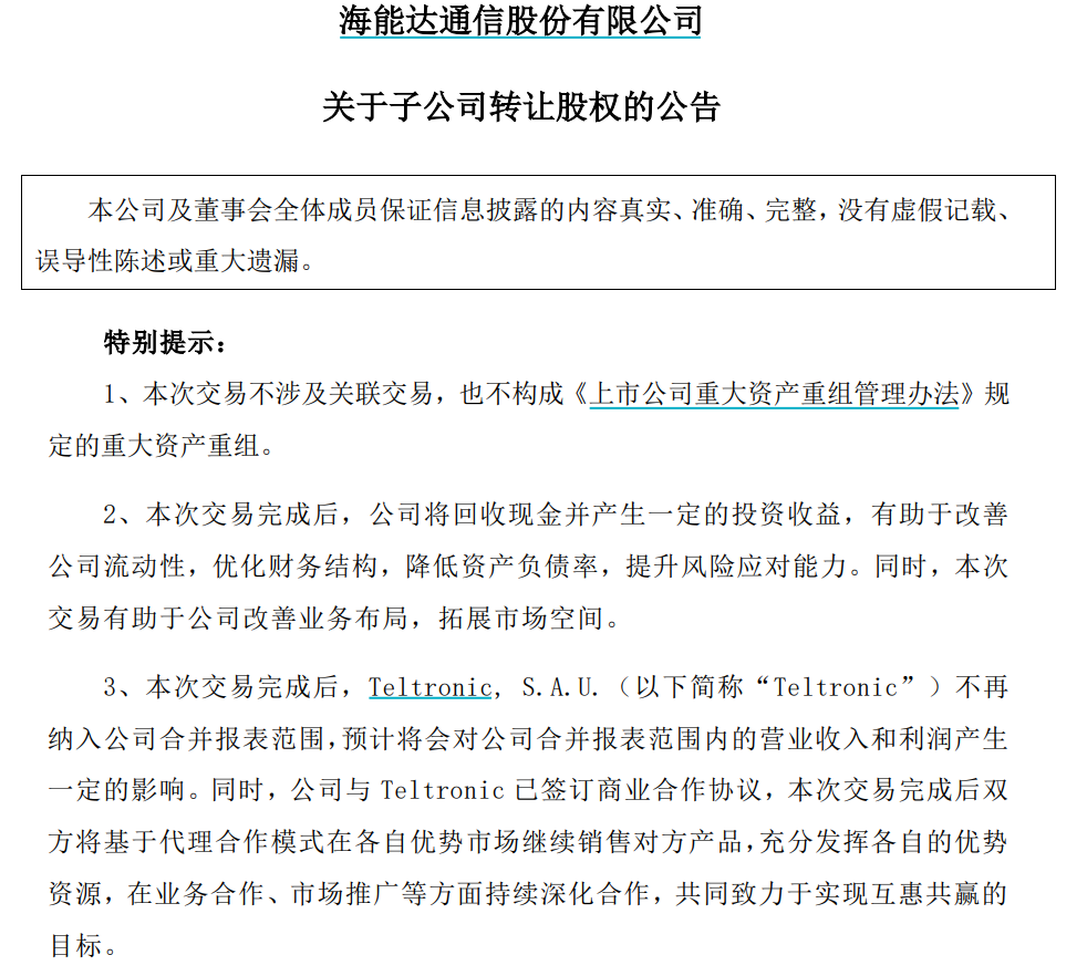 日前,海能达召开第五届董事会第十九次会议,审议通过了《关于转让子公司股权的议案》,同意公司子公司Teltronic Corporation, S.L.U.拟以7550万欧元(约合人民币6.28亿元)的价格,转让其全资子公司Teltronic, S.A.U.(下称Teltronic)100%股权。此次交易对手方Next Gen Critical Comms,S.L.为西班牙私募股权公司Nazca Capital SGEIC S.A.的全资子公司,双方已签署股权转让协议,并完成转让价款支付及股权交割。