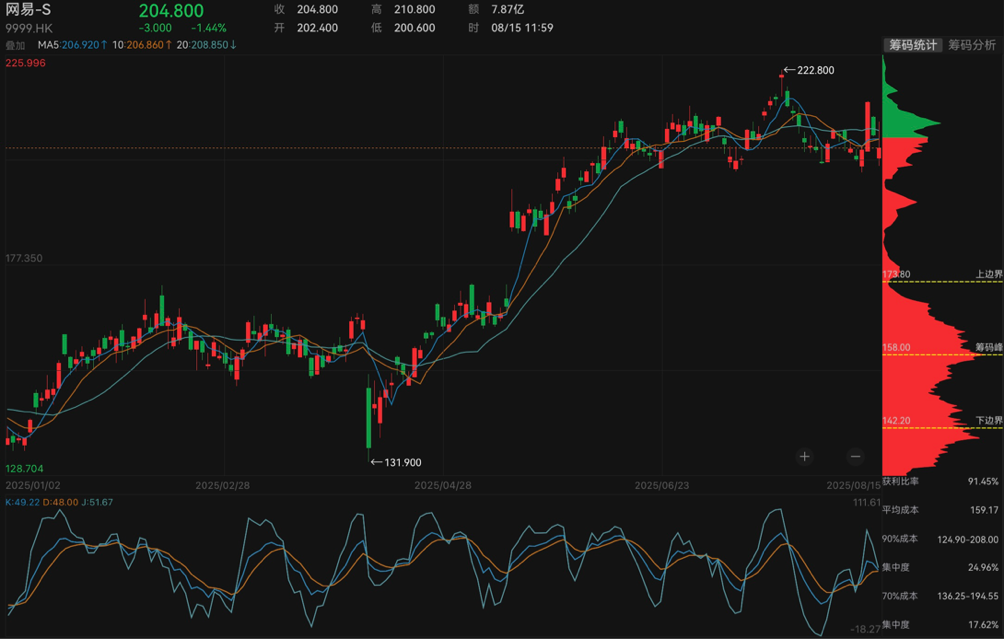 二级市场方面,2025年以来网易港股股价呈上升走势,并在7月23日盘中触及上市后新高点222.8港元/股(不复权,下同),随后该公司股价有所回落,但年初以来涨幅仍超过50%。