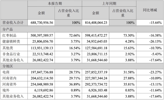 在此情形下,好想你区域市场的收入表现难言乐观。数据披露,2025年上半年,该公司来源于河南省内、河南省外、境外的收入分别较上年同期下降10.09%、13.11%和11.64%,而这三个区域的收入占比分别为29.71%、36.89%和0.89%,合计占比超过六成。
