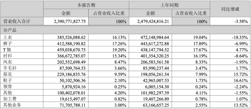 以此为背景,作为以品牌服装研发、生产和销售为主营业务的企业,报喜鸟控股股份有限公司(下称报喜鸟,002154.SZ)业绩承压在产品结构中体现得尤为显著。